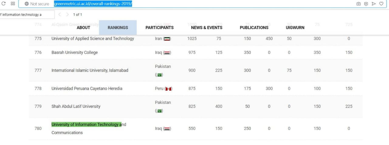 حققت جامعة تكنولوجيا المعلومات والاتصالات انجازا مهما بدخولها الى تصنيف Green Metric والذي يعتمد على معايير اهتمام الجامعات بقضايا التنمية المجتمعية والاستدامة البيئية، ومدى التزامها بالممارسات الصديقة للبيئة، وحرصها على زيادة الوعي ضمن نشاطاتها داخل الحرم الجامعي والمجتمع بالرغم من محدودية المساحات الخضراء للجامعة وقلة الموارد الا انها استطاعت ان تسجل حضورها بما متوفر من امكانيات . تسعى الجامعة بعد ان سجلت حضورها في هذا التصنيف الى تحسين ترتيبها في التصنيف من خلال تبني موارد للطاقة البديلة وادراج مواد دراسية تهتم بالبيئة والتنمية المستدامة الى المناهج وحث الباحثين في الجامعة على تناول مشاكل البيئة والتنمية المستدامة والعمل على اشاعة ثقافة الحفاظ على البيئة والتنمية المستدامة وقيم العدالة الاجتماعية .